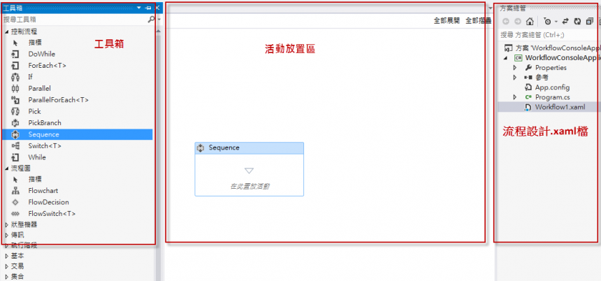 新增好專案後左邊有工具箱中間的畫面可以將工具箱的各種Activity拖曳進來,右邊有個Workflow1.xaml流程設計檔。