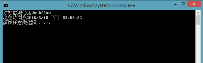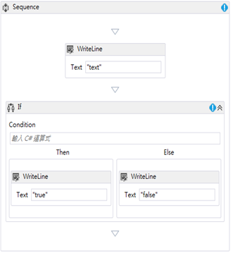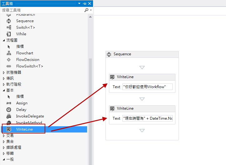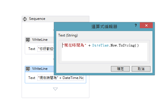 再來我們把WriteLine放入Sequence中再將想要顯示的文字輸入到Text欄位裡,在這裡要注意到因為是字串所以要用””(雙引號)把文字包起來。我們也可以在裡面加入取得現在時間的屬性(DateTime.Now)不過要記得轉成字串。