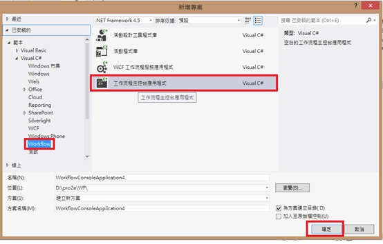 我們首先新增一個專案,選擇Workflow >> 工作流程主控台應用程式專案 >> 確定。